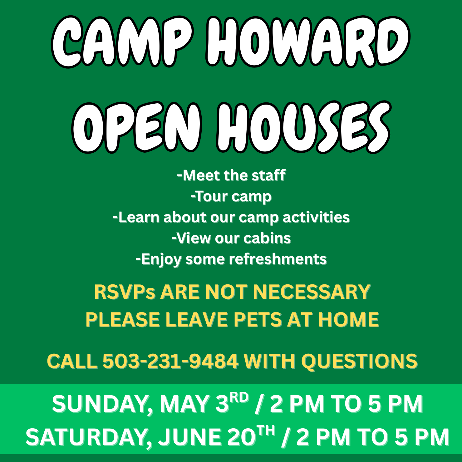 Join us for one of our 2026 Open Houses to tour our camp, meet our staff, and learn about camp activities. Tasty homemade refreshments will be provided in Mary's Lodge. Get your questions answered by our leadership team while you take in the scenic beauty of Camp Howard. No need to sign up — just drive out and meet us either May 3rd or June 20th from 2 PM to 5 PM. (Please note: pets are not allowed at camp.) Camp Address: 11010 SE Camp Howard Rd, Corbett, OR 97019